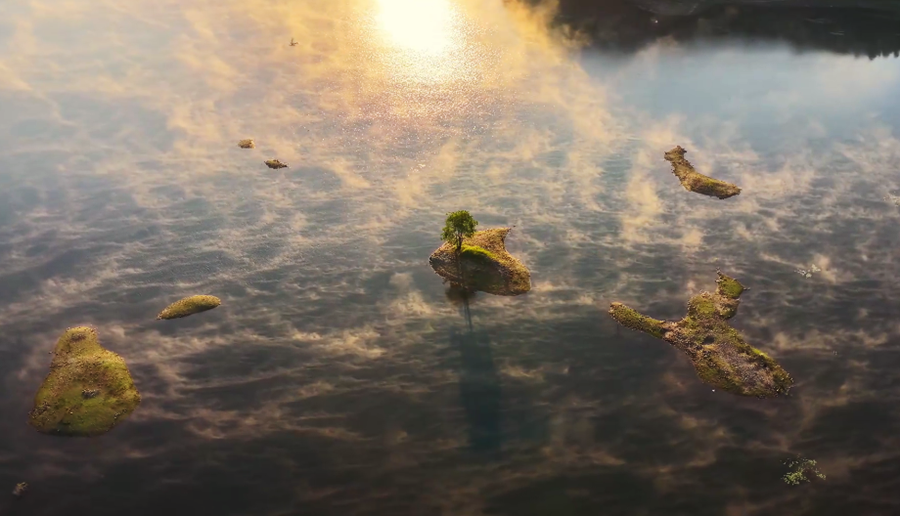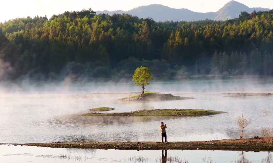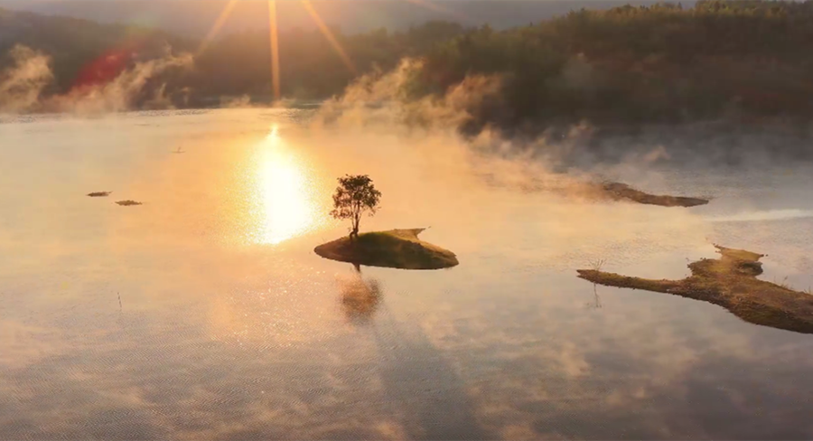 近日,安徽省黟县奇墅湖晨雾弥漫,金色的霞光洒在湖面上,熠熠生辉,宛若诗意画卷。(施亚磊)