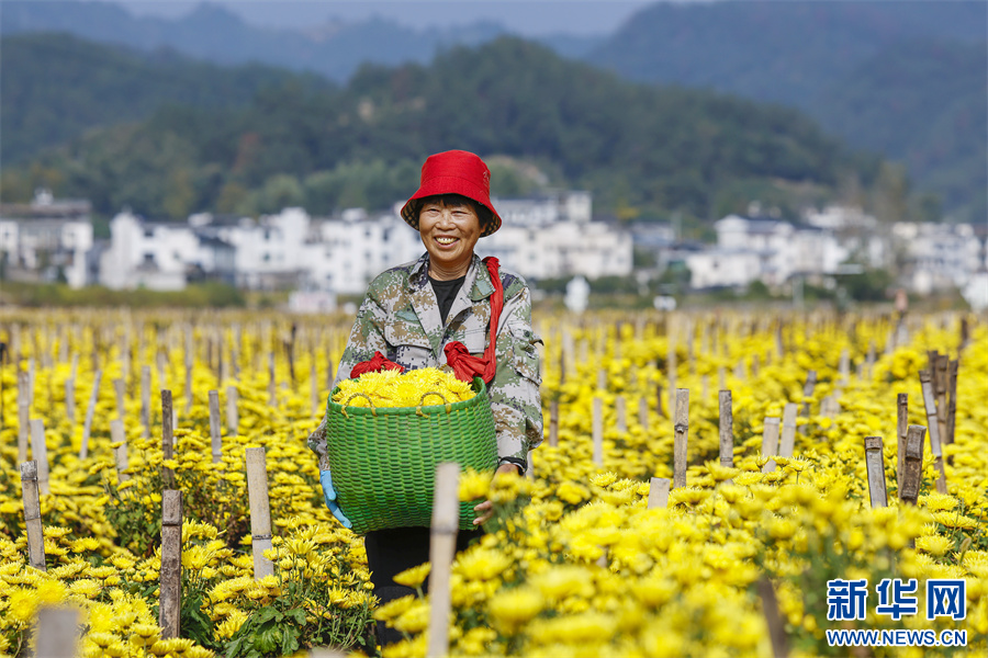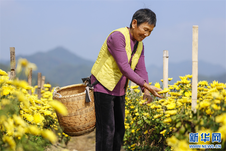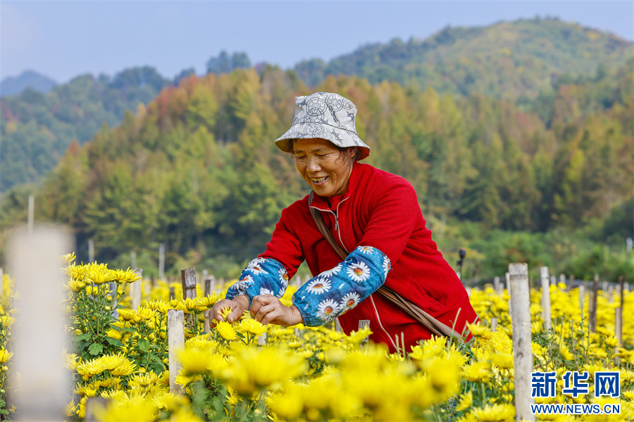 10月28日,菊农在安徽省黄山市歙县溪头镇桃源村采摘金丝皇菊。