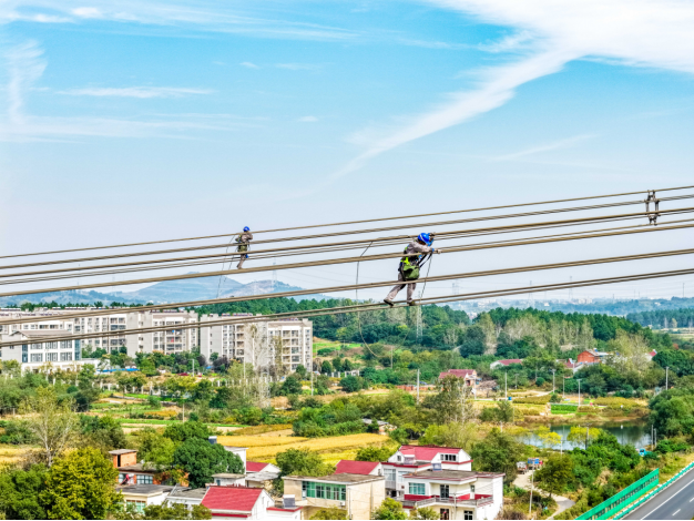 10月29日,在合肥市庐江县冶父山镇境内,±1100千伏昌吉—古泉特高压直流输电线路工程5822号铁塔上方,国网合肥供电公司和安徽送变电工程有限公司检修人员在近50米高空,沿着线路稳步前行,开展精细化检修作业。