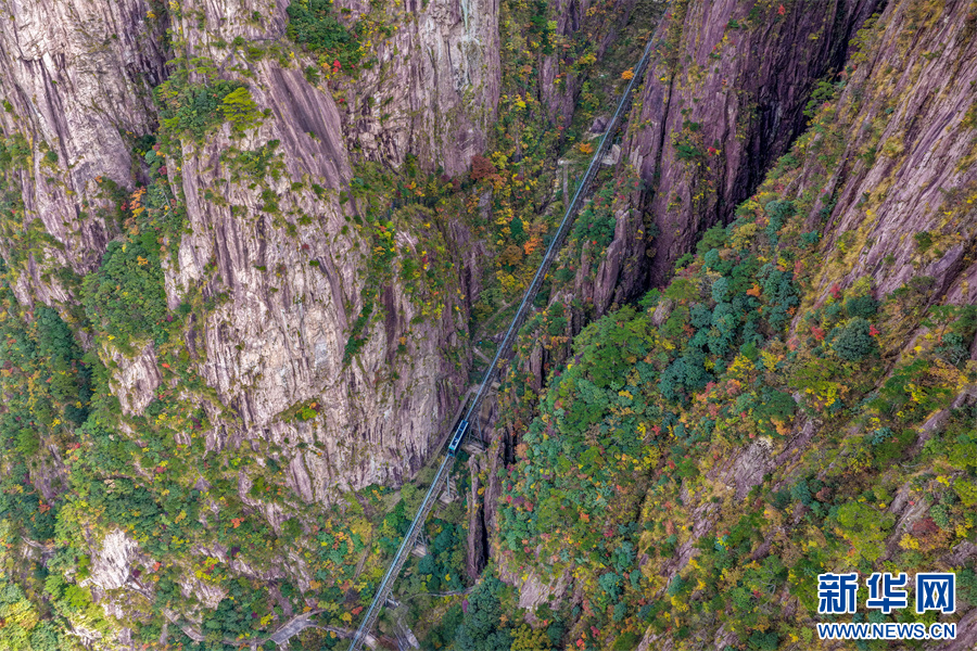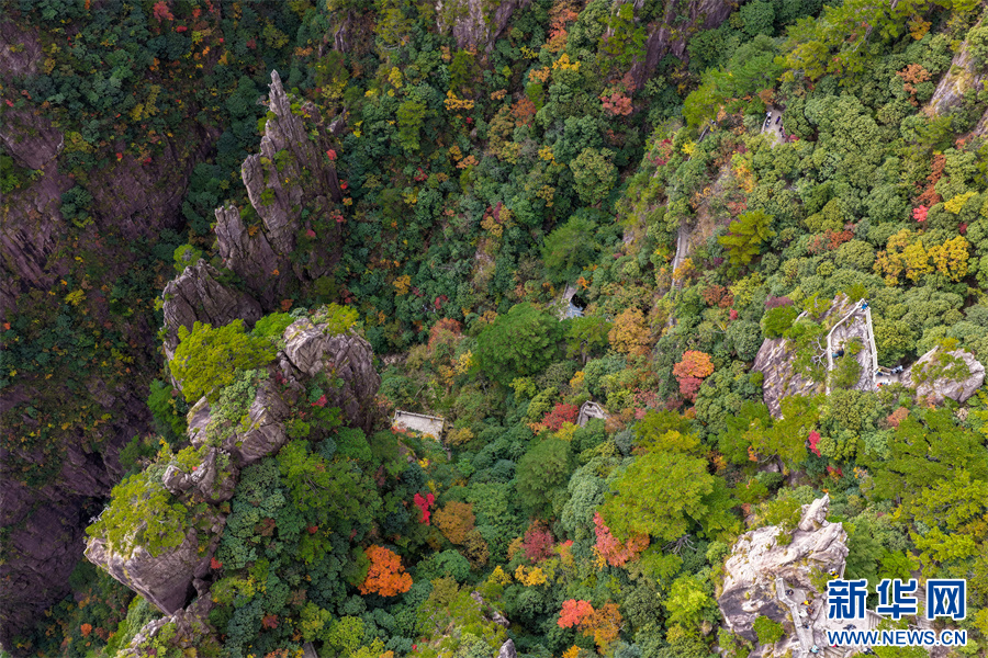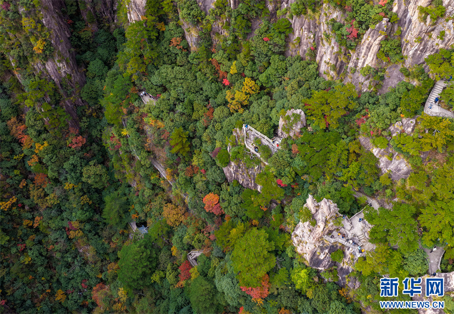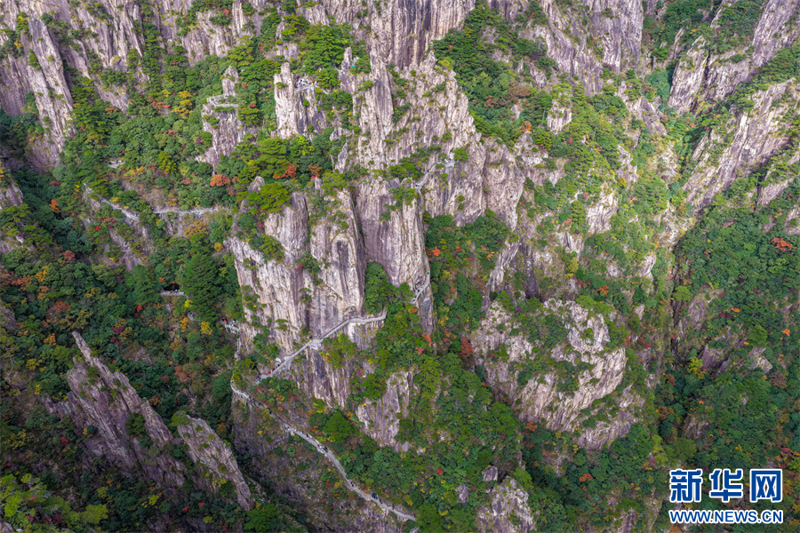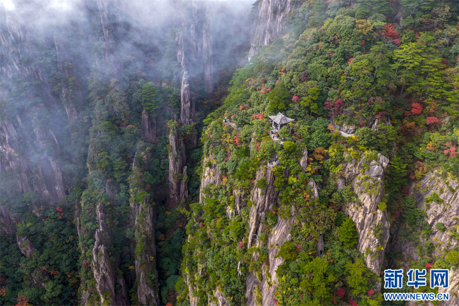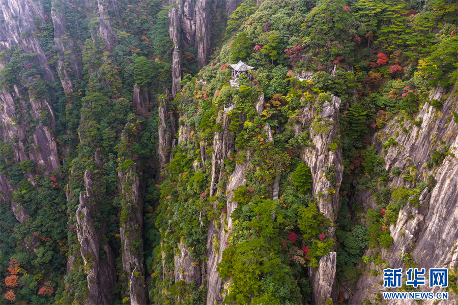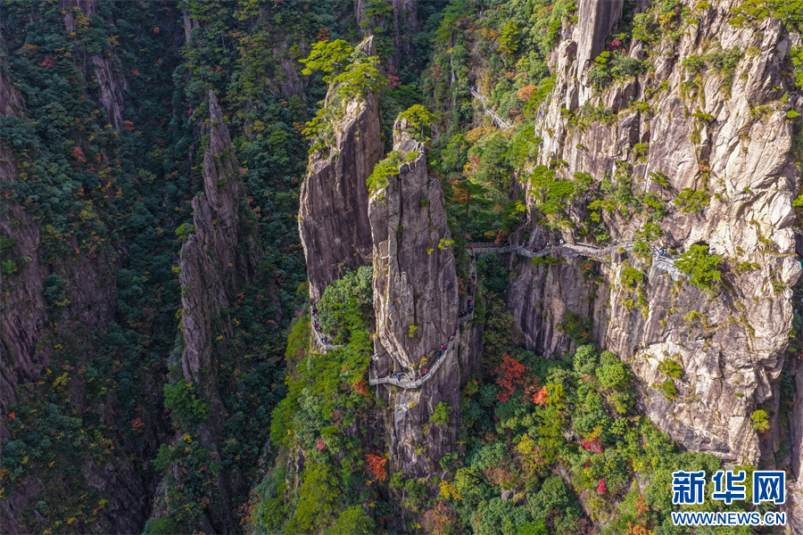 当日,安徽省黄山风景区西海大峡谷秋色绚烂,峰林间点缀着橙、红、黄交织的彩叶,与苍劲奇松、嶙峋怪石相映成趣,为雄伟的黄山增添诗意与柔情,引得游客驻足流连。新华网发(施亚磊 摄)