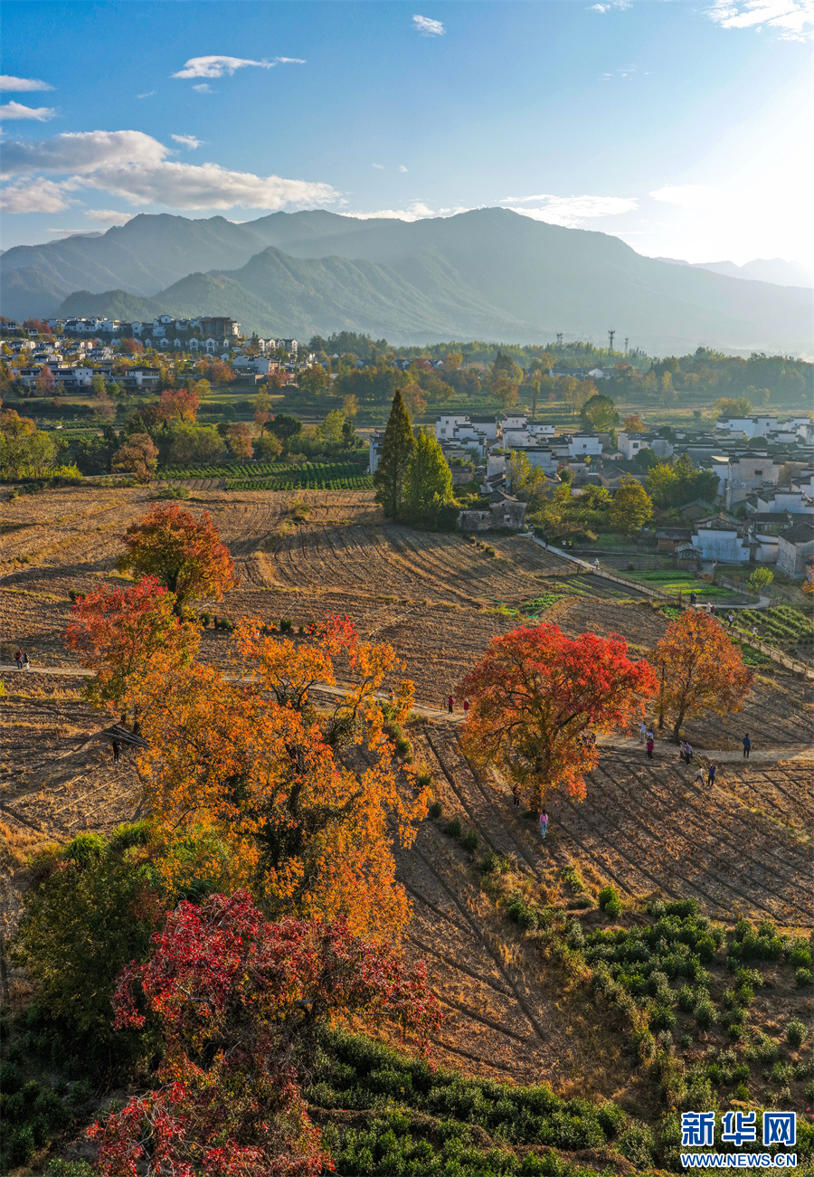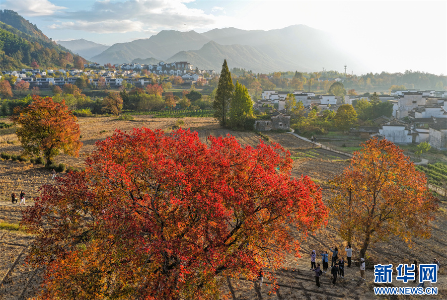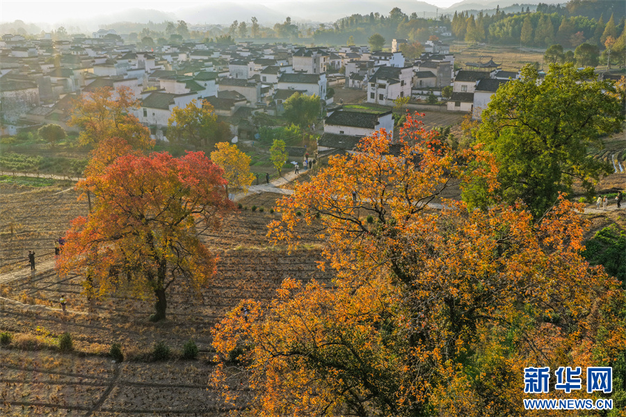 初冬时节,黟县宏村镇卢村晨雾缭绕,色彩绚丽的乌桕树与白墙黛瓦的徽派古村落交相辉映,构成一幅诗意盎然的乡村画卷,吸引众多游客前来观赏。新华网发(施亚磊 摄)