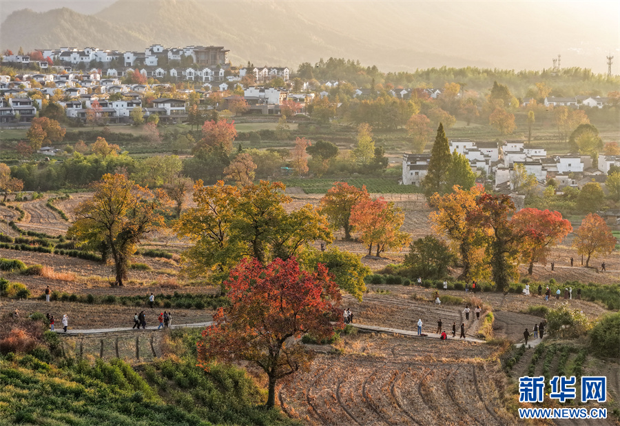 11月13日,游客在安徽省黄山市黟县宏村镇卢村欣赏旖旎风景。(无人机照片)