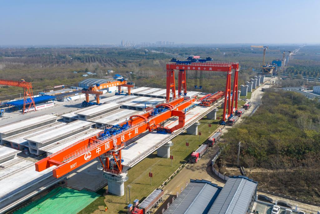 近日,合武高铁安徽段全面进入箱梁架设阶段,施工人员奋战在架梁一线,确保重点铁路工程建设进展顺利。
