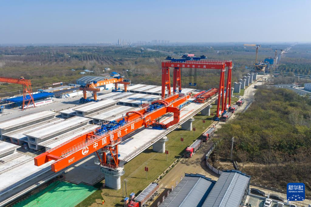 这是合武高铁安徽段站前一标肥西制梁场首榀箱梁架设现场(11月15日,无人机照片)。