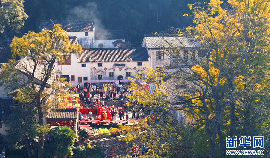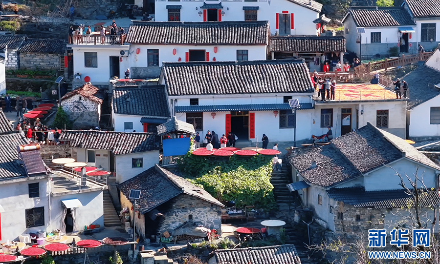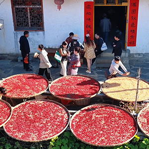 近日,安徽省池州市石台县七都镇画坑村迎来丰收盛景。当地村民在传统晒场上铺满新收的玉米、辣椒等作物,金黄的玉米、火红的辣椒与古朴的白墙黛瓦相映成趣,勾勒出一幅绚丽的乡村丰收画卷。这场独具特色的活动,也吸引了众多游客和摄影爱好者前来打卡、拍照。(王帆 徐丽红 摄)