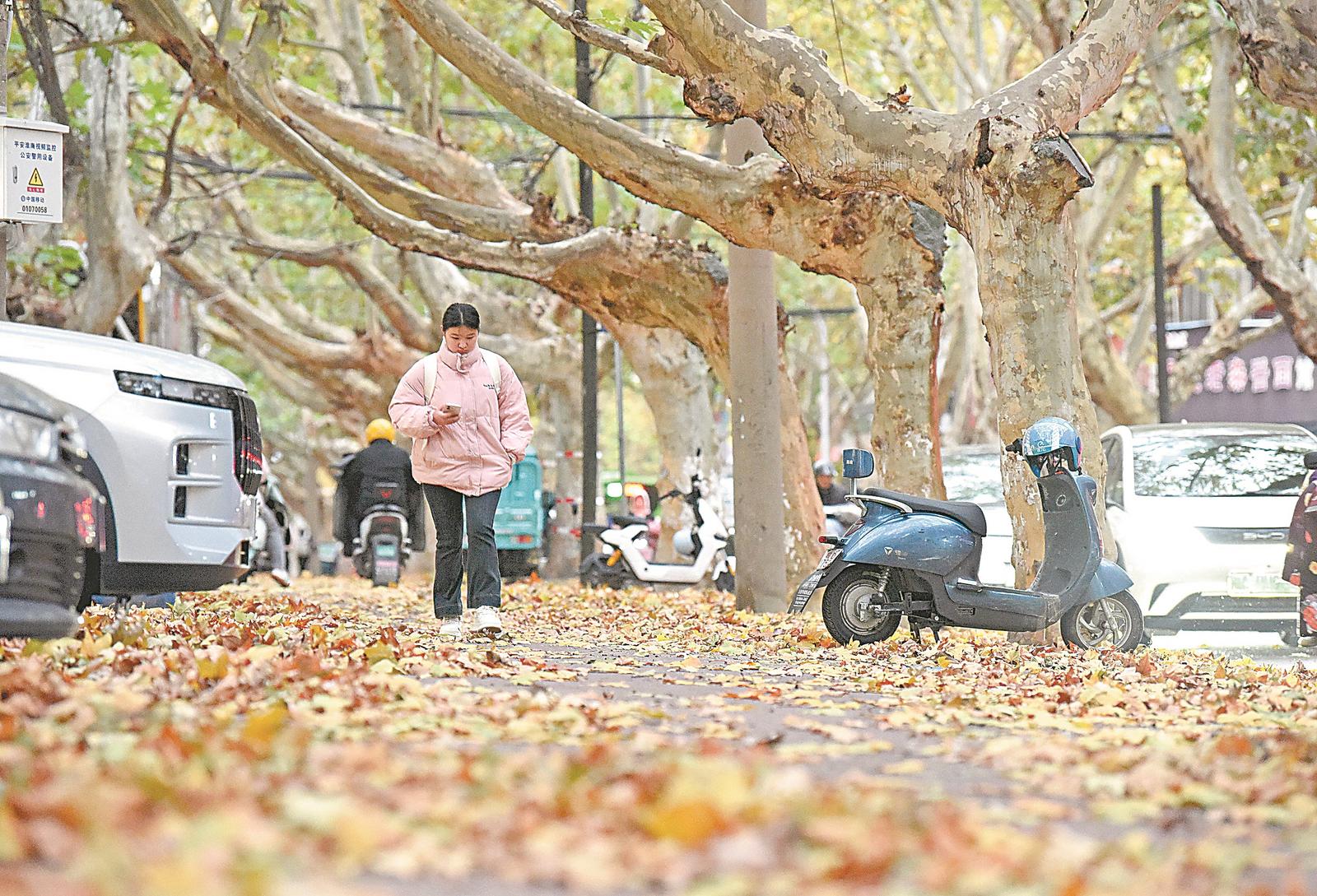 十一月十七日,气温骤降,行人走在淮南市内落满树叶的路上。 视觉中国供图