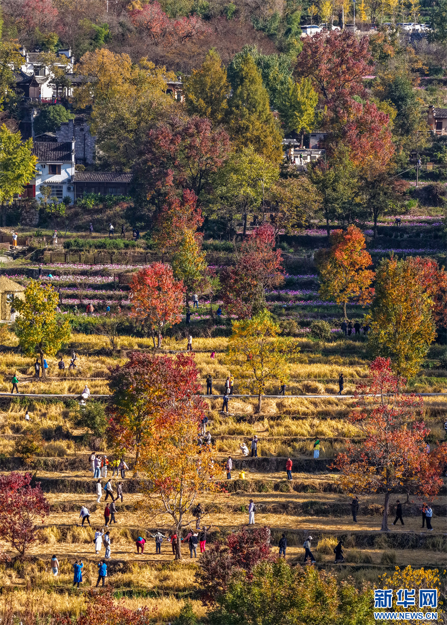 近日,安徽省黄山市黟县宏村镇塔川国家森林公园进入最佳观赏期。层林尽染的树木与粉墙黛瓦的古村落相互映衬,构成一幅诗意盎然的冬日画卷,吸引众多游客前来赏景游览。新华网发(施亚磊 摄)