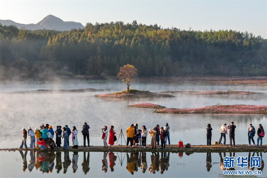 近日,游客在安徽省黄山市黟县宏村镇奇墅湖欣赏晨雾美景。当日,湖面水雾蒸腾,鎏金般的霞光洒在湖面上,熠熠生辉,游客徜徉其间,流连忘返。新华网发(施亚磊 摄)