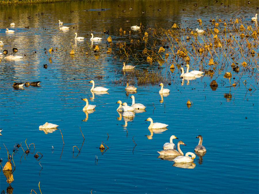 11月20日,安徽省池州市月亮湖湿地迎来小天鹅越冬。