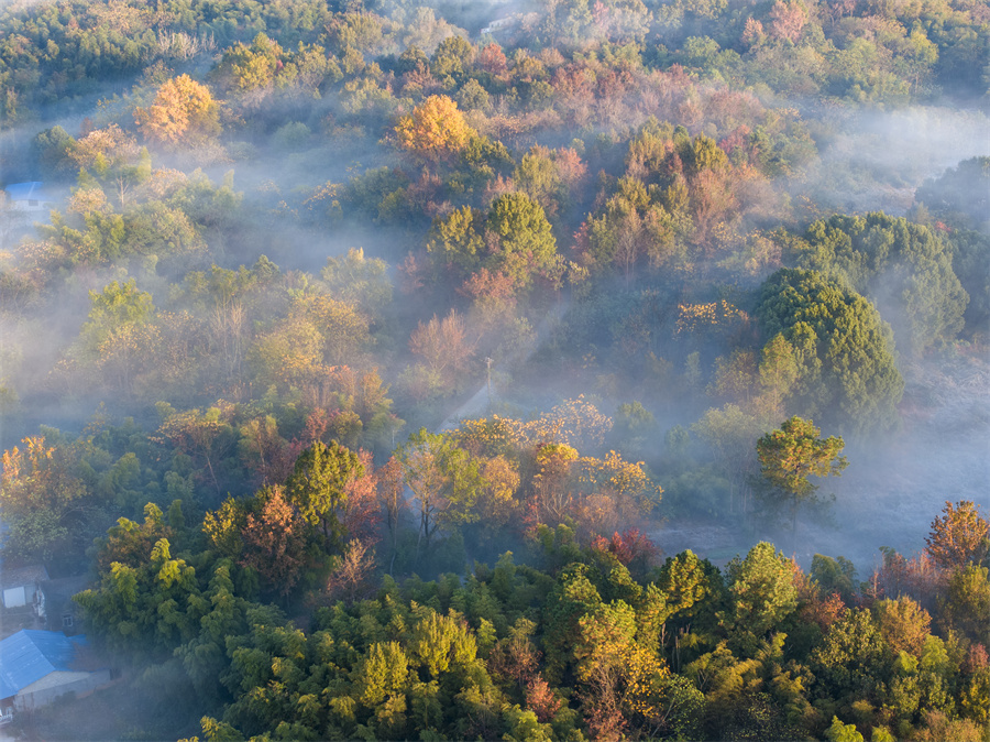 11月20日,安徽省池州市晨雾弥漫,黄红的树叶与绿色植被融合在一起,如同打翻的调色盘,五彩斑斓,绚丽多姿。新华网发(程爽 李春 摄)