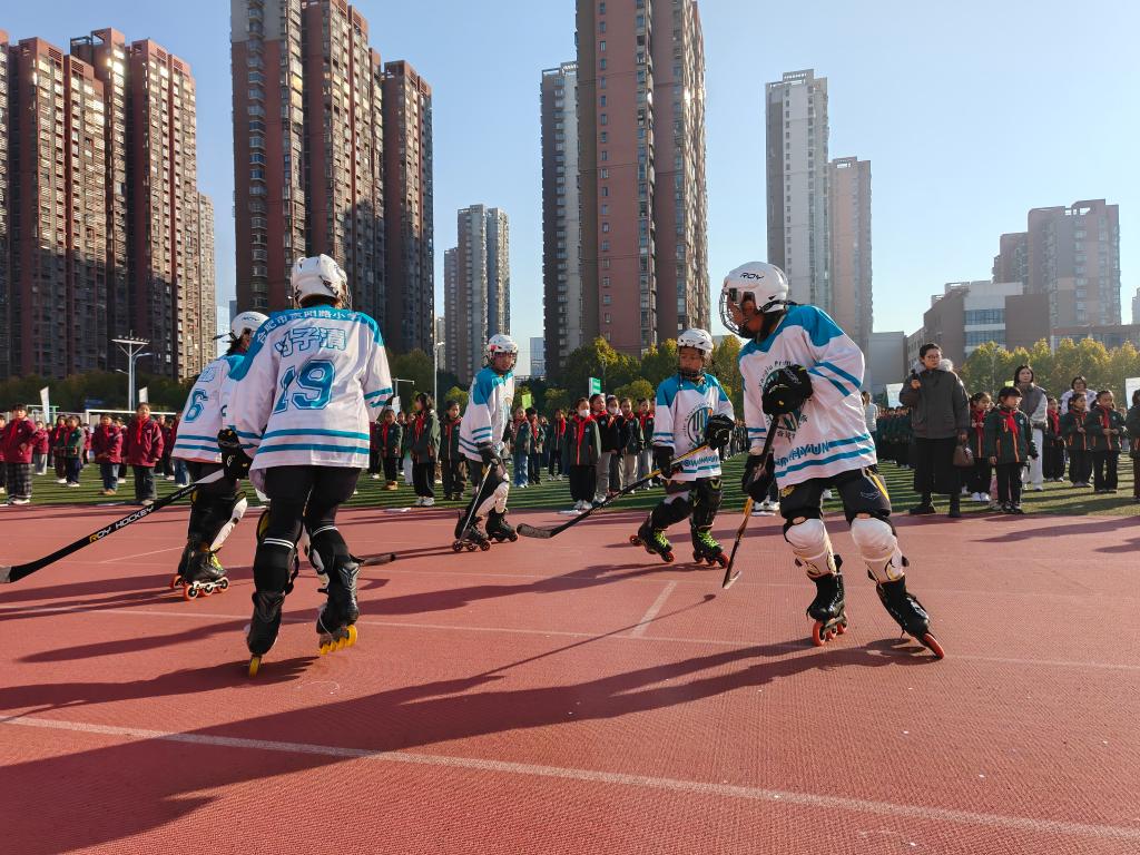 合肥市贵阳路小学的轮滑球校队正在展演