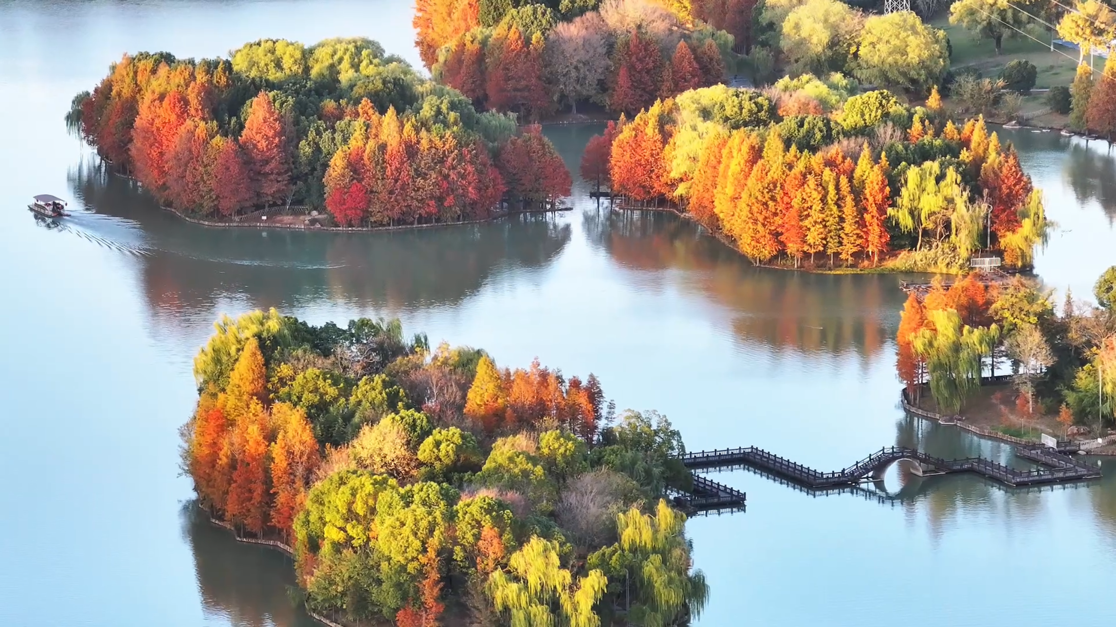 初冬时节,安徽省颍上县五里湖湿地红杉碧水相映成趣。层林尽染、五彩斑斓,宛如一幅流动的油画。(徐红梅)