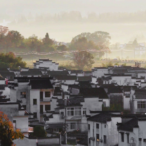 近日,安徽省黄山市黟县卢村晨雾缭绕,徽派民居错落有致,与漫山红叶交织成一幅流动的水墨画卷,美不胜收。(肖融)