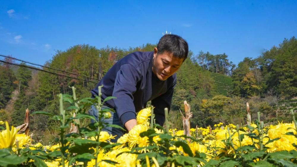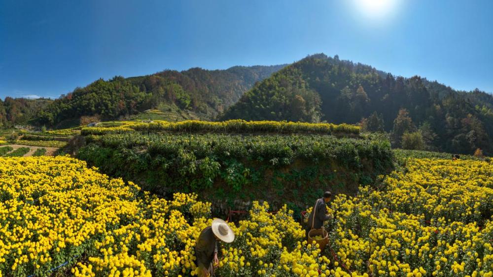 石河村培育的黄山贡菊清冽回甘、徽州皇菊醇厚绵长、金丝菊汤色透亮,这些在山雾中滋养出的佳菊,是村民餐桌上的养生好物,也是致富增收的“金花瓣”。