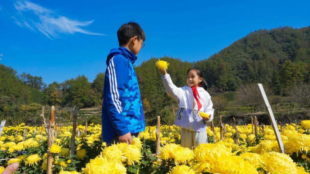 “酒香也怕巷子深”,为让石河村的菊花“走出深山、香飘四海”,驻村工作队充分利用新媒体平台,当起菊花产业的“宣传员”和“代言人”。他们举着手机穿梭在花海,镜头里有菊花绽放的娇艳、村民劳作的热忱,也有孩童嬉闹的天真。“黄山脚下藏花海,金丝菊香等你来”“泡一杯石河菊,品的是茶香,暖的是乡愁”……这些接地气的短视频带着山乡温情,在网络上迅速走红,引得各地游客前来“打卡”,更让批发商主动上门抢单,石河村菊花的名气越来越响。