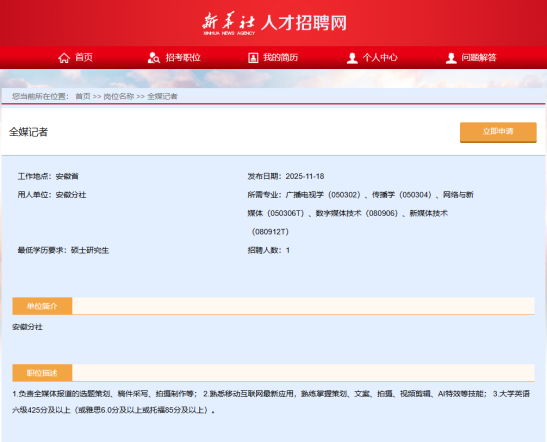 应聘者请于2025年11月19日9:00至11月30日18:00期间登录新华社人才招聘网(https://job.xinhua-news.cn)报名。