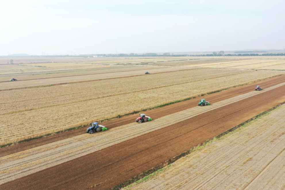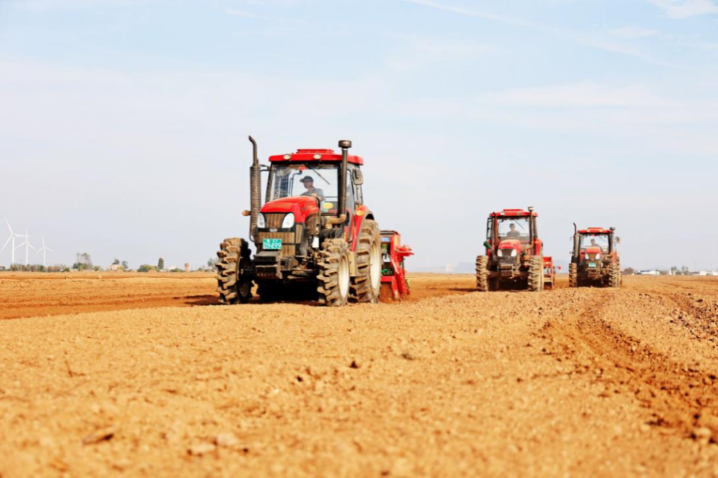 近日,在位于安徽省滁州市明光市的安徽农垦集团潘村湖农场第二农业生产管理区,5台旋耕施肥播种复式一体机正在开展小麦播种作业。“今年播期整体较往年有所推迟,采用轻简化新型机械作业,可缩短作业周期,促进及早出苗。”潘村湖农场总经理助理程国华说。