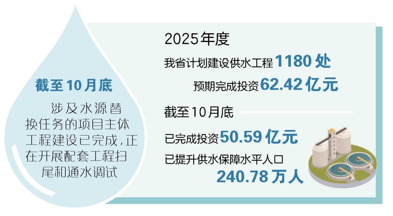 据了解,2025年度,我省计划建设供水工程1180处,预期完成投资62.42亿元。截至10月底,已完成投资50.59亿元,已提升供水保障水平人口240.78万人。