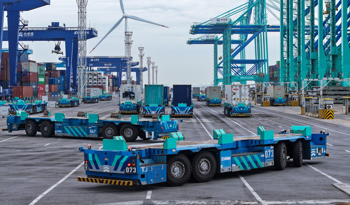 作为我国港口智慧化转型的“试验田”,近年来天津港持续推动传统码头全流程自动化升级,打造智慧绿色枢纽港口升级版。图为智能水平运输机器人行驶在天津港第二集装箱码头。(新华社)
