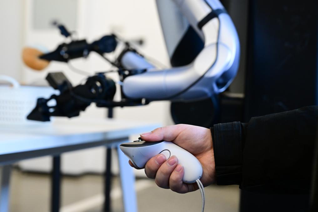 10月24日,在合肥乐聚机器人技术有限公司,工程师使用VR设备进行机器人遥操作,用于动作捕获采集数据。新华社记者 周牧 摄