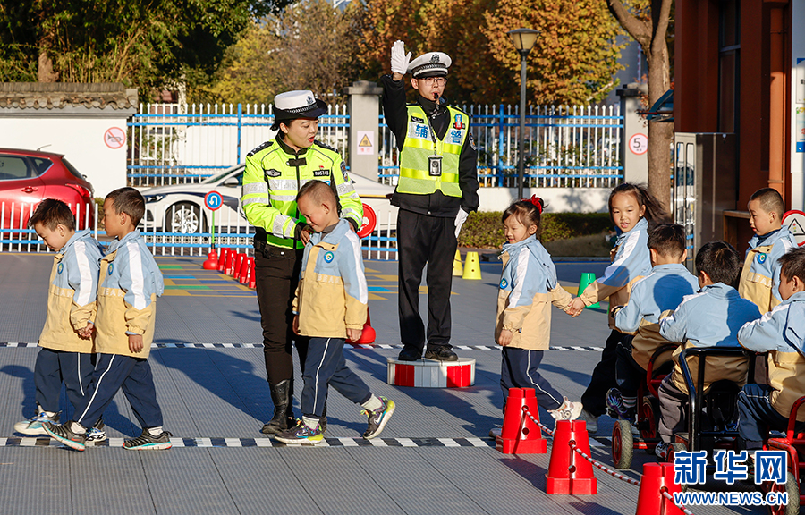 12月1日,在安徽省黄山市屯溪示范幼儿园,孩子们在交警的引导下模拟斑马线通行。