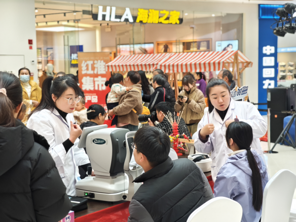 集市入口,便民服务区已排起了小长队。口腔诊所的医生正拿着口镜,一边给小朋友检查牙齿,一遍提醒要早晚刷牙;旁边的血压测量处,工作人员耐心地给群众缠上袖带,说道:“大爷,您血压有点偏高,平时少吃点盐,多出来遛遛弯儿。”还顺手把注意事项写在小纸条上递过去;验光师不仅给大家测视力,科普预防近视小妙招,还带来了趣味小游戏。