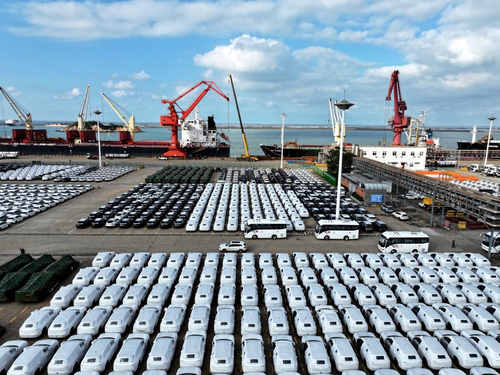 2025年10月14日,在江苏省连云港港东方港务分公司码头,大批汽车准备装船外运(无人机照片)。新华社发(王春 摄)