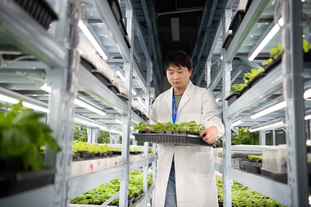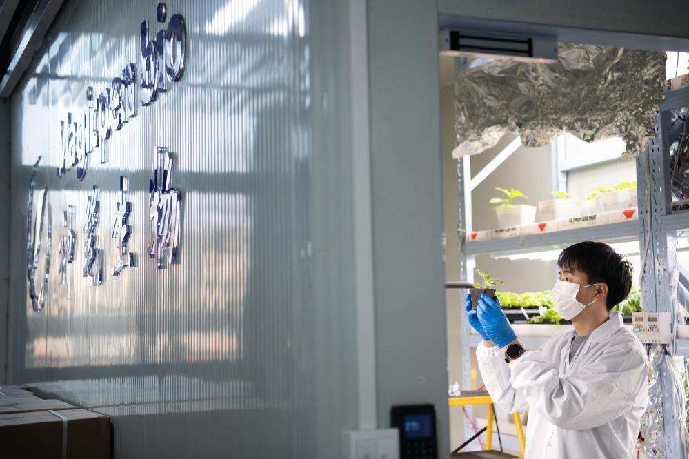 12月3日,在合肥神笔生物科技有限公司实验室内,研发人员苗良杰在查看烟草生长情况。新华社记者 张端 摄