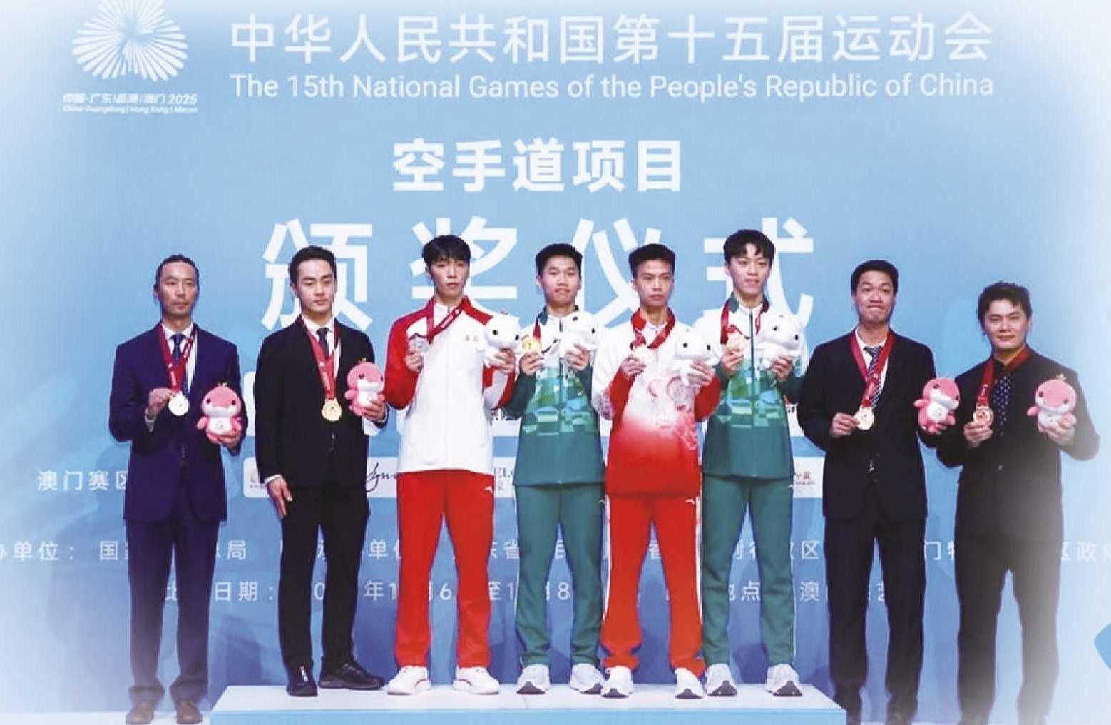 耿旭(左三)获得空手道男子-67公斤级银牌。
