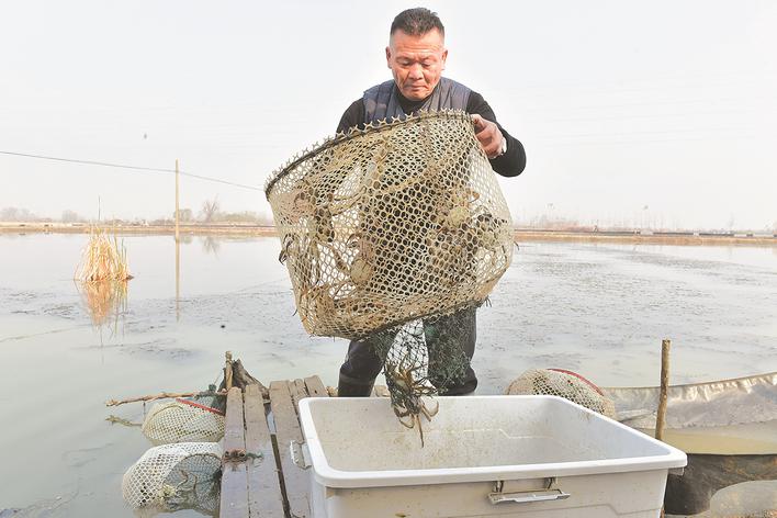 农历中秋节一过,杭胜丰养殖的母蟹陆续开捕,进入11月下旬,公蟹也接茬上市,预计亩产为200多斤。