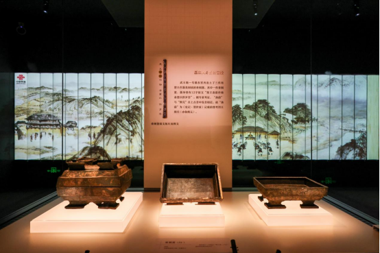 “分室藏珍”呈现文物三维影片。基于OLED屏幕,精准呈现“九鼎八簋”等重点文物的三维模型,结合图文说明,实现文物的深度解读与互动探索。