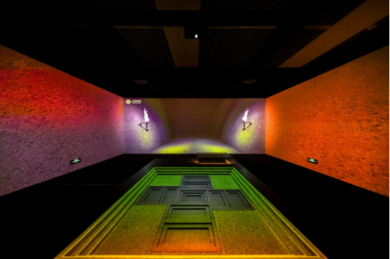“椁室藏玄契”打造沉浸式空间体验。采用沉浸式投影系统与实体沙盘结合,将复杂的“亞”字形椁室结构进行动态可视化呈现,让观众能直观理解墓葬的精巧布局与礼制格局。