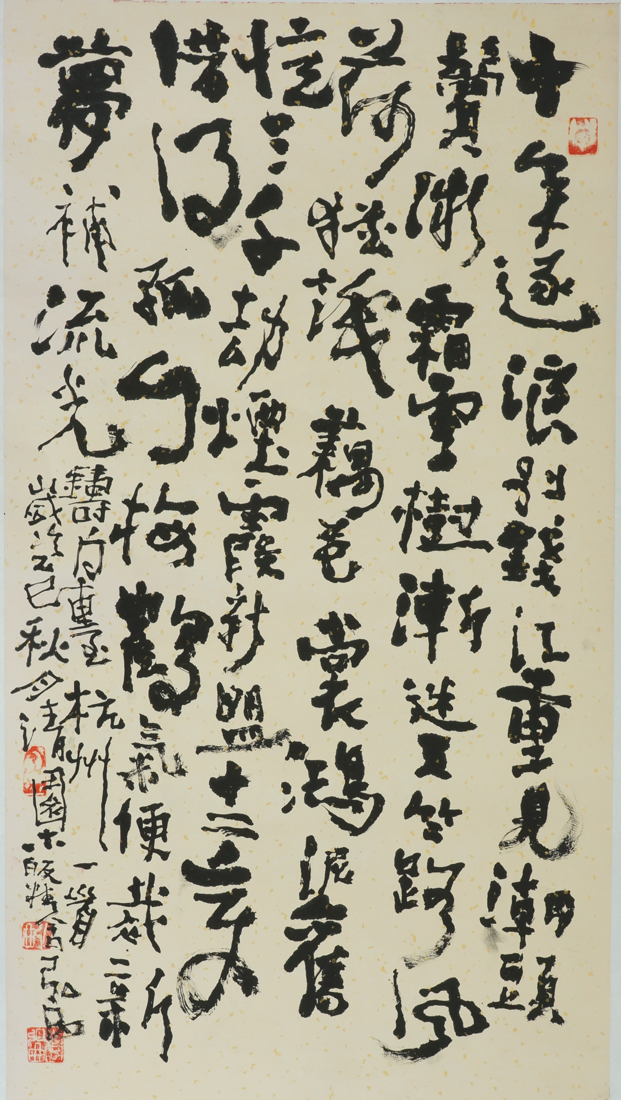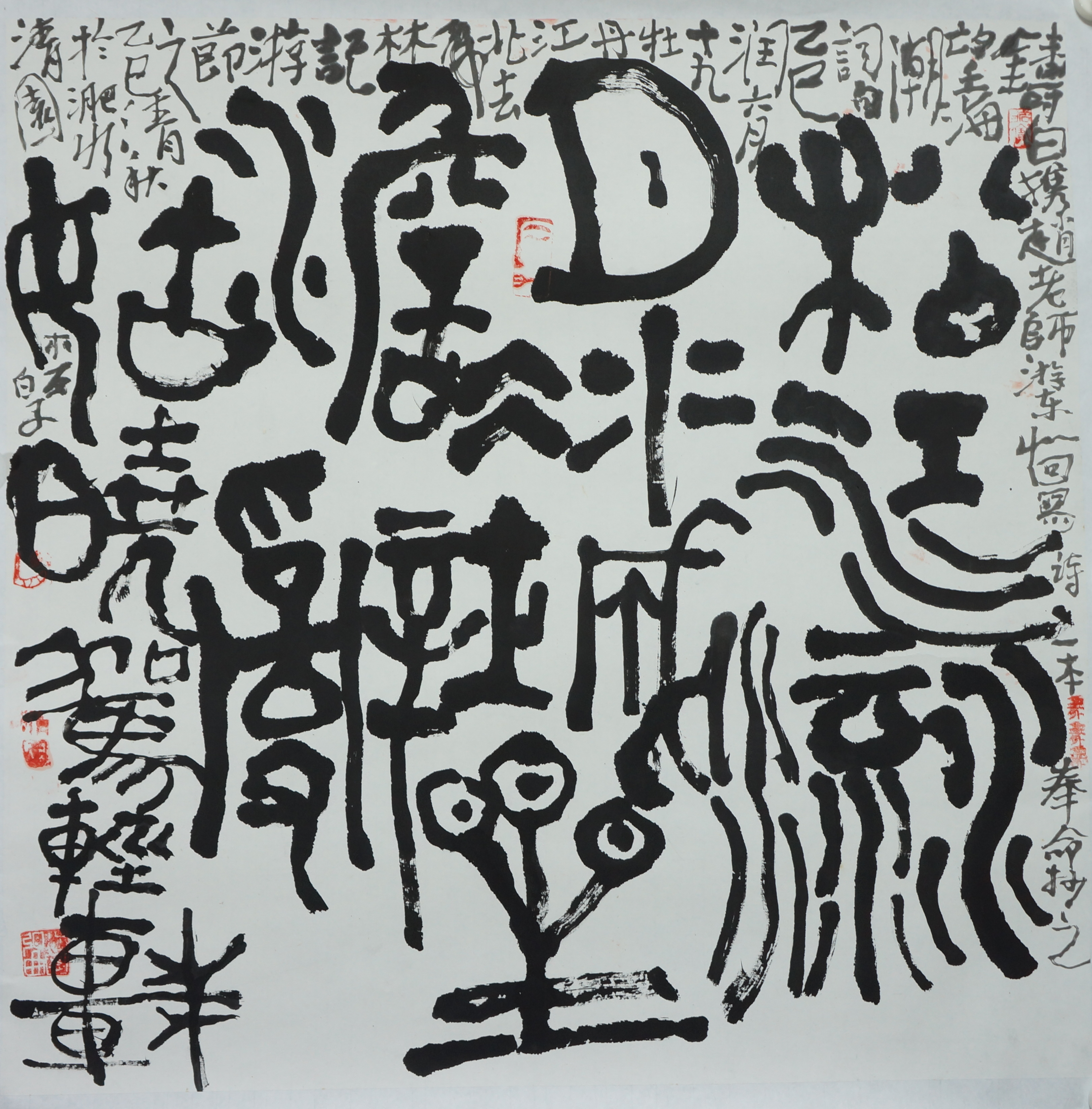 所谓写字,早年弘曲却有画神之功。他用篆籀笔意书写楷魏行草,不断试验、体悟书法的沉静之道。在弘曲看来,大篆运笔不存在固定的方向,实事求是地说,在用笔端画字的过程中,在没有方向感的笔意中,能体会到一种方正和古拙笔意,犹如滚珠,其笔意四处迸散,能体会到滚珠之中的这种方正笔意,实属不易。