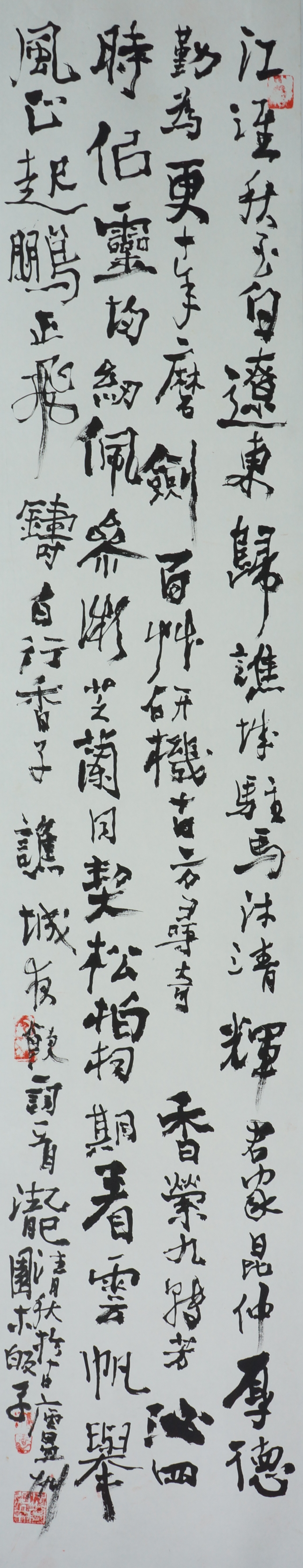 弘曲认为,书道犹如站立之人,首先是站稳了再说。我们纵观弘曲书法,每一笔画,不论伸向何方,都是先有交代,然后立锥成桩,这就是弘曲经常自我告诫的书法之道:笔首先放上去再说。