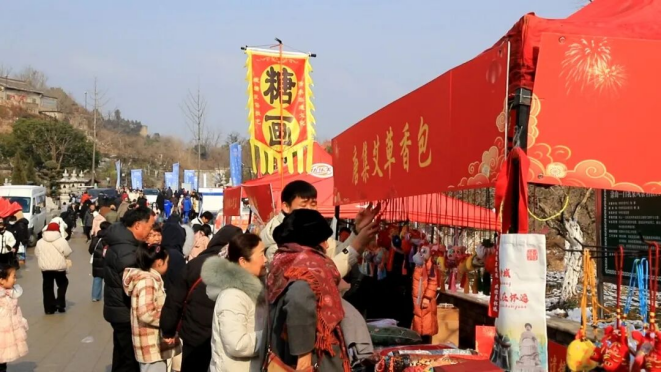 景区市集是活动另一大亮点。80多家摊位有序排布,既有“全鸡宴”(烧全鸡、药膳鸡、地锅鸡)、石榴饮品、炒货蛋糕,也有石榴文创、非遗手作、民俗饰品等产品,琳琅满目、烟火气十足。