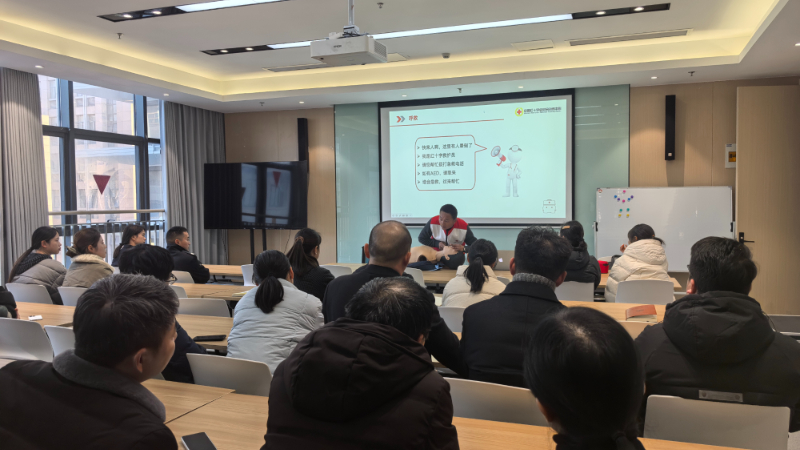 培训现场,红十字会志愿服务队的志愿者通过“理论精讲+实操演练”的沉浸式教学,让急救技能成为政务服务的“安全标配”。针对心脏骤停的“黄金4分钟”救援法则,志愿者详细讲解了心肺复苏的完整流程:从环境安全评估、意识与呼吸判断,到胸外按压的深度(5至6厘米)、频率(100至120次/分钟),再到“仰头提颏法”开放气道与人工呼吸的规范操作,每一个关键步骤都配合人体模型进行分步演示。在海姆立克急救法教学中,志愿者重点讲解了“先背击、后冲击”的操作流程,针对成人、儿童、孕妇等不同人群的施救差异进行专项说明,消除了参训人员的认知误区。