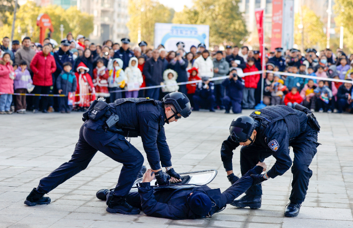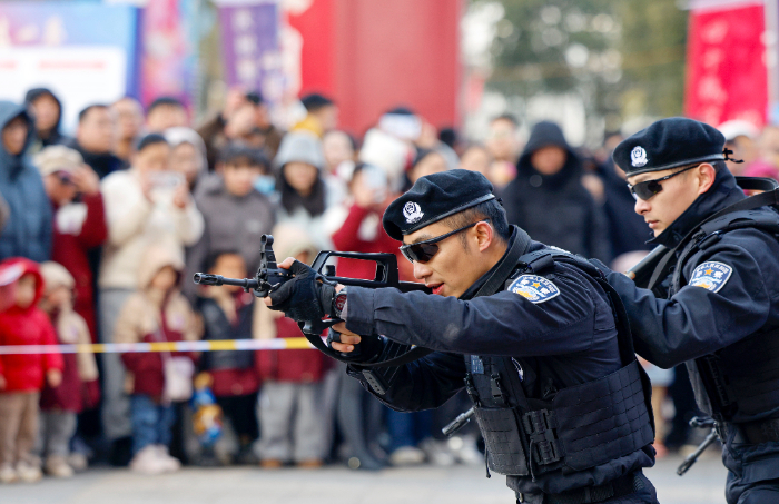 1月10日,安徽省黄山市屯溪区,特警战术展示。