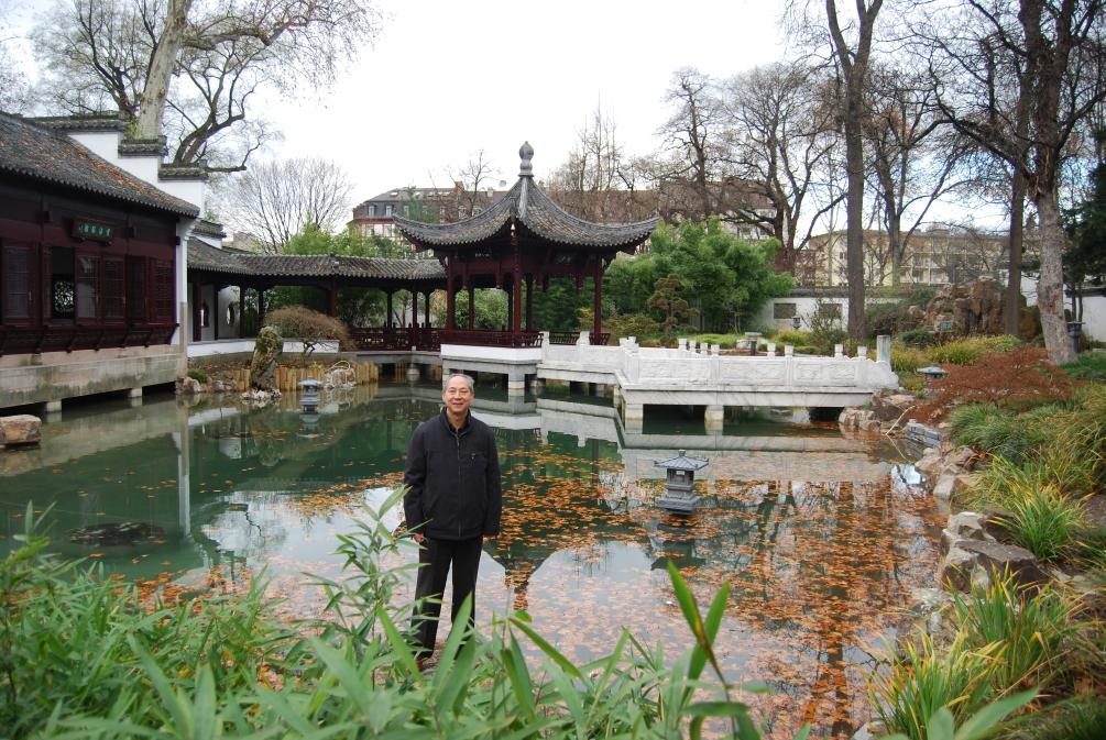 2007年10月,程极悦在德国法兰克福市春华园整体维修提升工程现场拍照留念(受访者供图)。