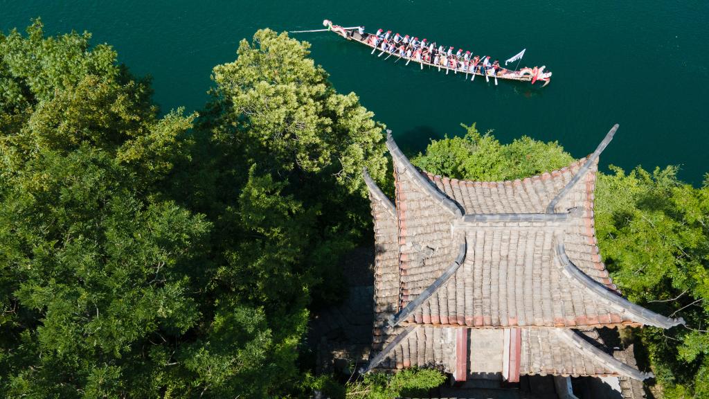 2025年5月29日,一支龙舟队在桃花潭风景区划龙舟。
