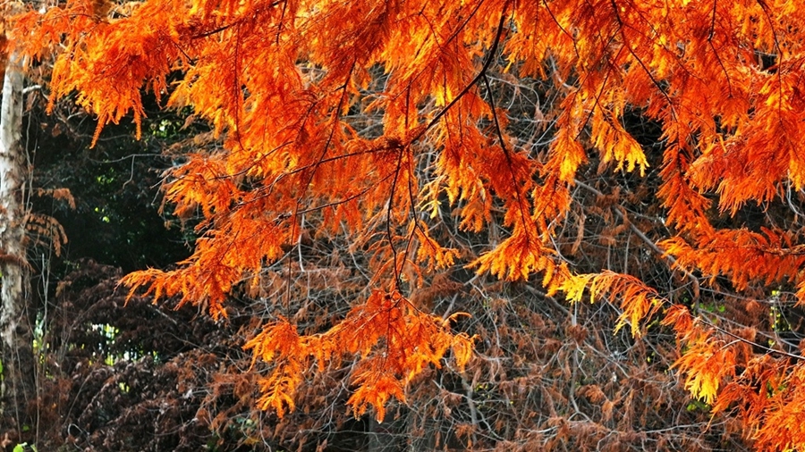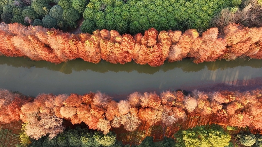 近日,望江县华阳镇幸福河畔迎来了一年中最富诗意的景致。漫步河岸,清澈的流水倒映着沿岸斑斓的树影,成片的红杉褪去青翠,披上了由红色的盛装,在冬日暖阳的映照下,如同一幅铺展在天地间的温暖油画,吸引了许多市民与摄影爱好者前来记录这份限定美好。