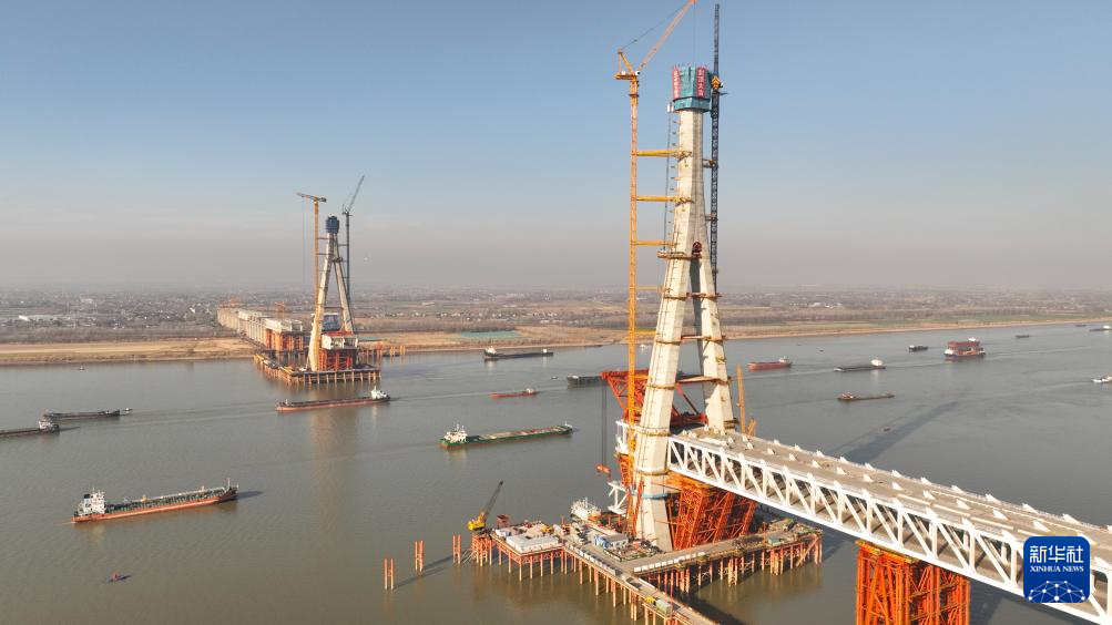 1月15日拍摄的封顶完成的池州长江公铁大桥南主塔(无人机照片)。