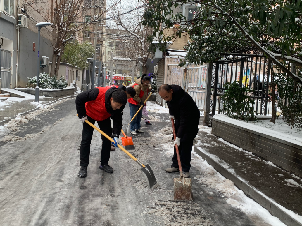 凌晨的街头寒气袭人,志愿服务队的队员们不畏严寒,身着红马甲、手持铁锹和扫帚,迅速投入战斗。大家分工明确、配合默契,有的用铁锹奋力铲除路面厚实的积雪和冰层,有的用扫帚仔细清扫残留的浮雪,铁锹与地面碰撞的“叮叮当当”声、扫帚清扫积雪的“沙沙”声,在寂静的清晨汇成了温暖有力的劳动乐章。社区工作人员还积极动员辖区物业人员、热心居民等基层力量,带着自家的清扫工具主动加入队伍,形成了“社区引领、多方参与、全民共治”的生动局面。