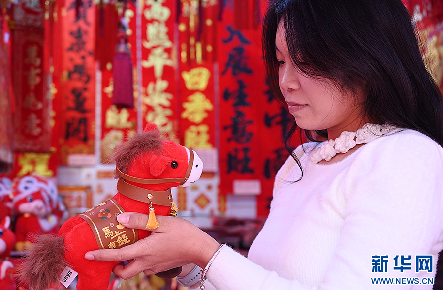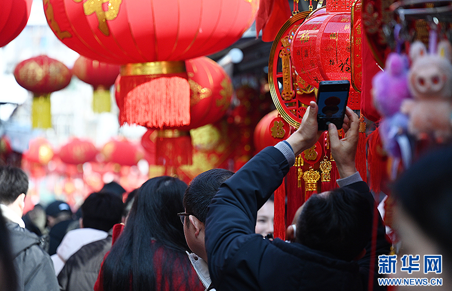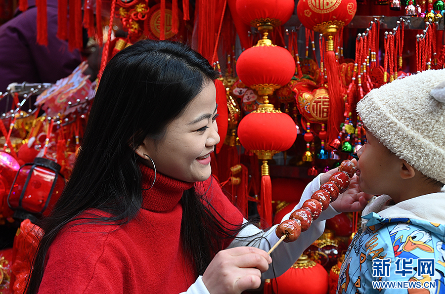 1月24日,市民在安徽省合肥市城隍庙市场内品尝冰糖葫芦。随着春节临近,合肥市城隍庙市场内挂满了大红灯笼、春联等节日饰品,年味浓厚,吸引不少市民前往选购。新华网发(杨晓原 摄)