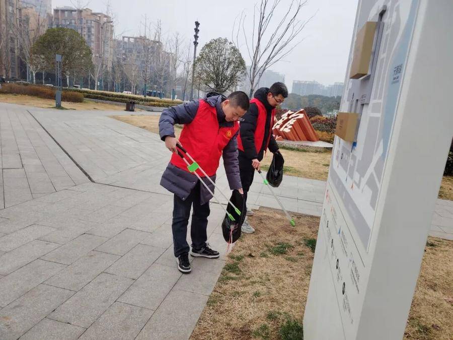 笔架山街道志愿者对合肥市中心图书馆及周边区域开展整治。