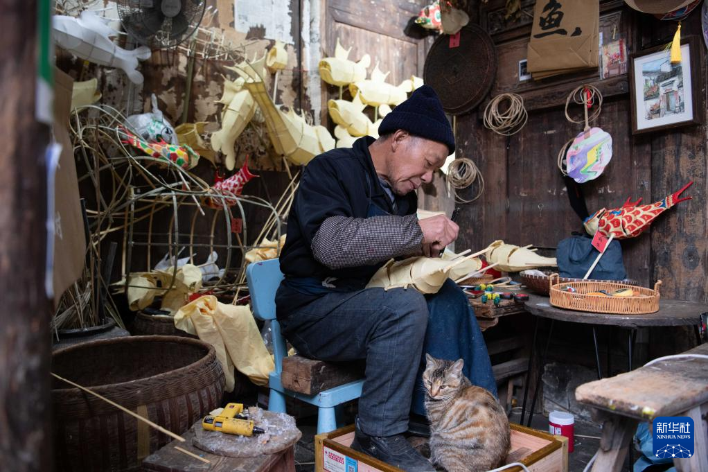 2月7日,在安徽省黄山市黟县碧山村,手艺人在制作鱼灯。