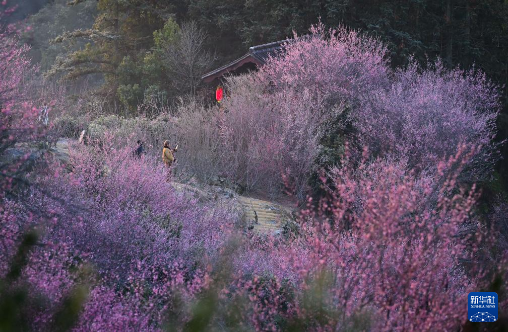 近日,在安徽省黄山市歙县雄村镇卖花渔村,漫山遍野的梅花绽放,花海与徽派村落民居相映成趣,景美如画。