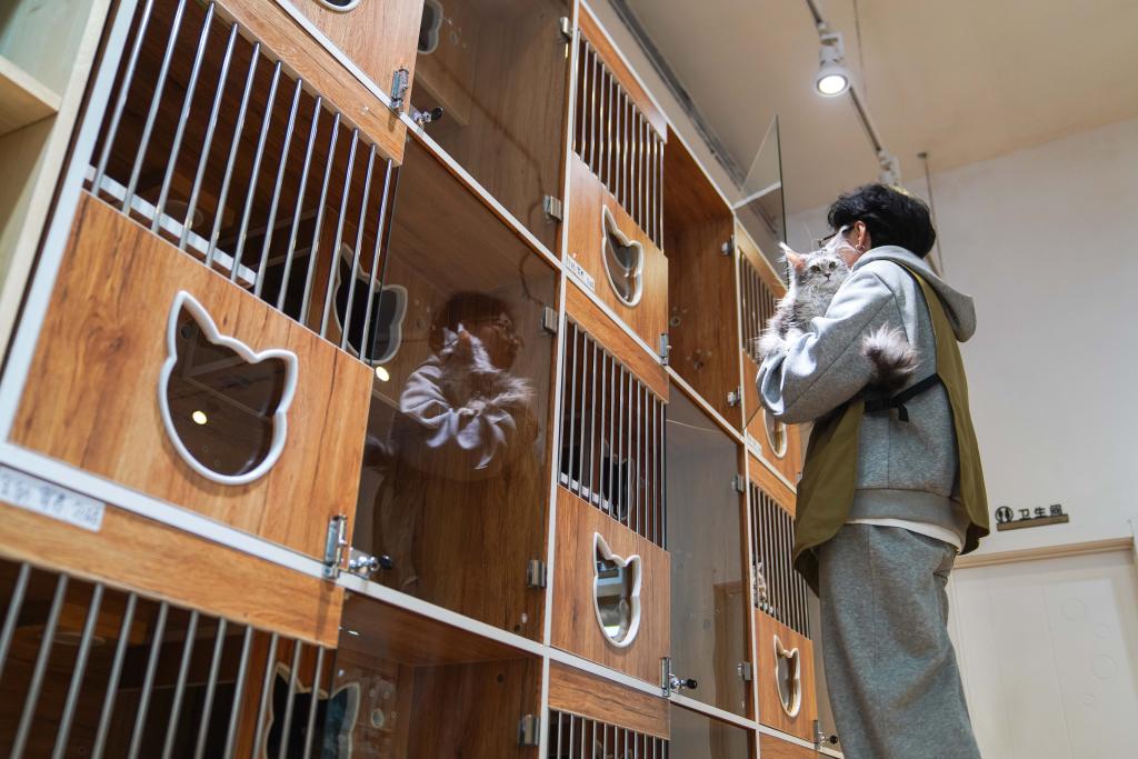 2月4日,在吉林省长春市一家宠物店内,饲养员李梦思从柜子中抱出一只将在店内寄养过春节的宠物猫。
