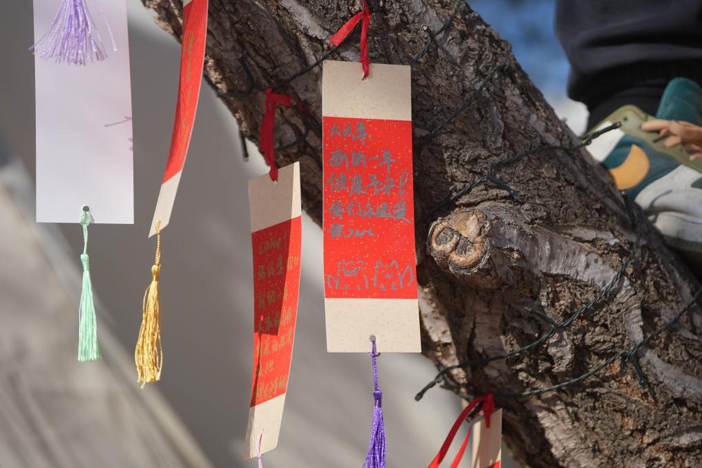 这是1月31日在北京市昌平区“北京犬时代宠物公园”内的宠物庙会拍摄的树上悬挂着的祈福牌。