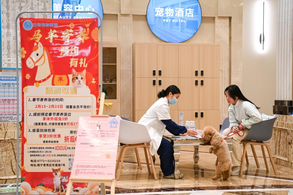 2月1日,在广西南宁一家宠物医院,工作人员(左)在介绍春节宠物寄养服务内容。