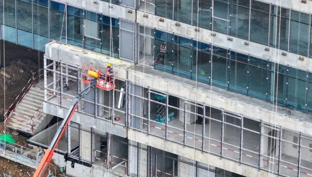建筑外立面已初具规模,装饰幕墙施工正在有序推进。
